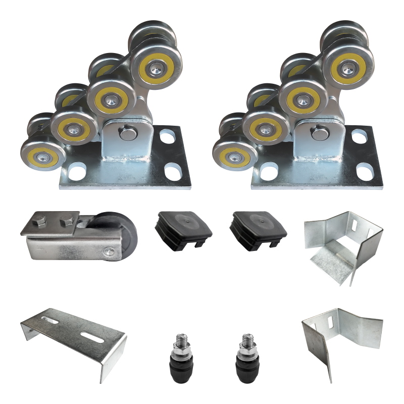 Наиболее выгодный вариант комплектации для откатных ворот, в состав которого входит всё необходимое, кроме направляющей балки: 2 роликовых опоры, верхний и нижний ловители, концевой ролик, заглушка и кронштейн с роликами бокового качения.